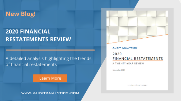 Audit Analytics recently released a new report, Financial Restatements: A Twenty-Year Review. This annual report, containing an updated format, takes a closer look at trends in financial restatements, spanning from 2001 to 2020.